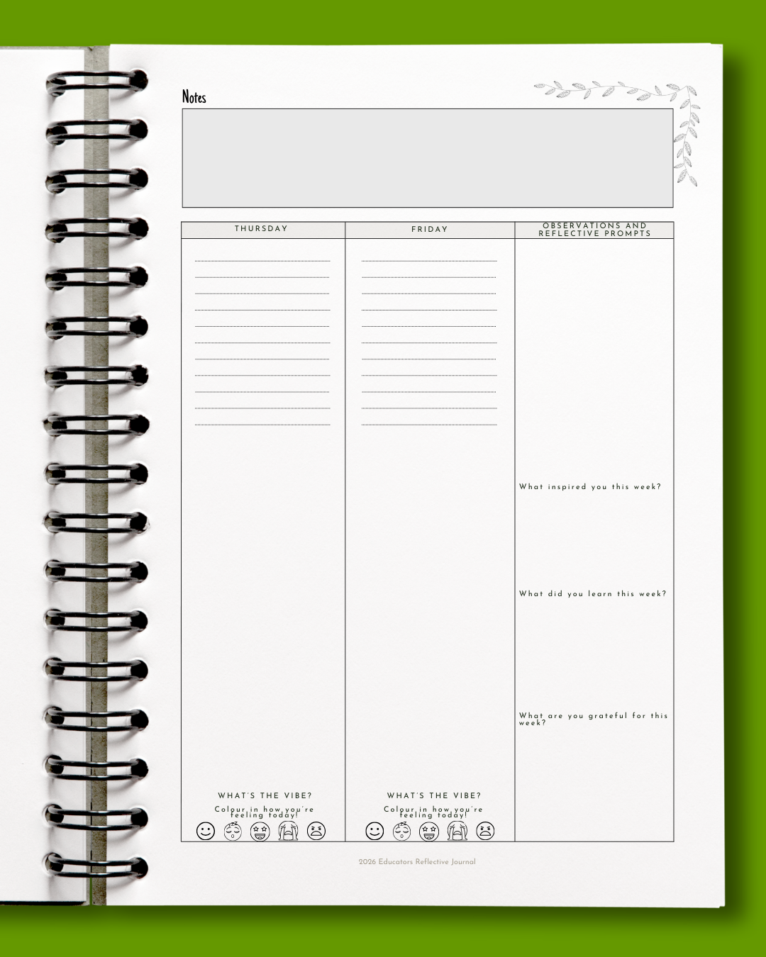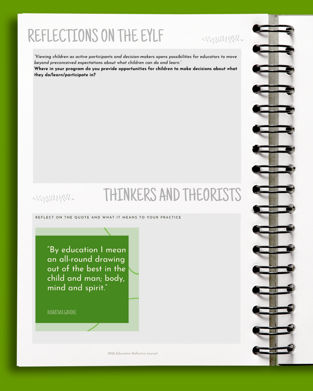• Monthly reflective prompts and programming space to document experiences, supporting critical self-assessment and continuous improvement in your everyday practice,